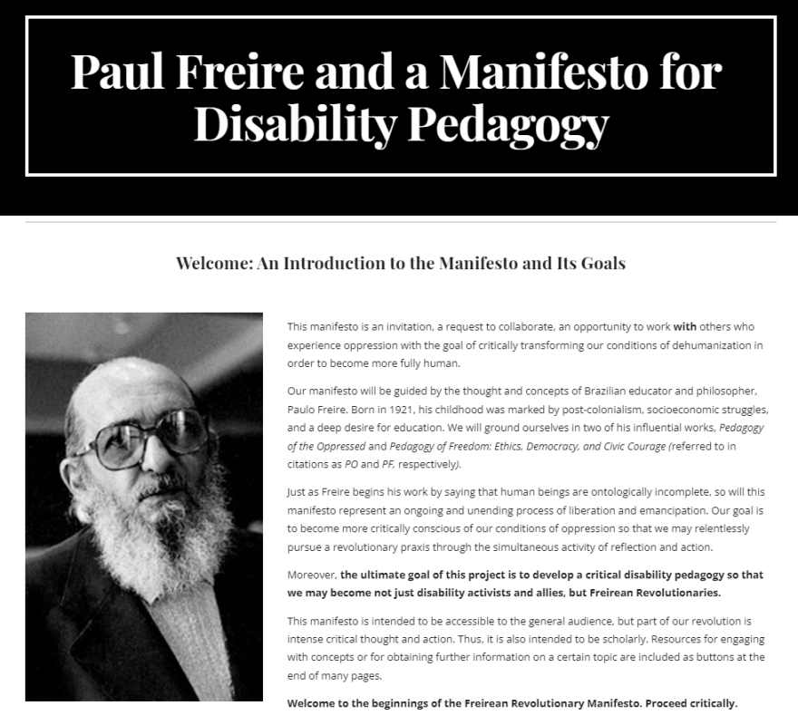 This website connects the work of Paulo Freire to Disability Studies, with an emphasis on shifting the ways in which people with disabilities are perceived in culture and society. Further, this text draws on Freire’s work to highlight the Disability Rights movements (historical and present) and to provide readers with specific action items that can help shift readers from allies to activists.