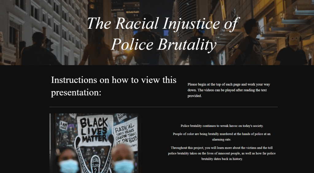 This project explores the topic of police brutality by combining primary, survey-based research with a profile-style explication of 7 cases where police brutality was brought into the spotlight. Six of the seven cases focus on specific people, and one on a protest and the police response.